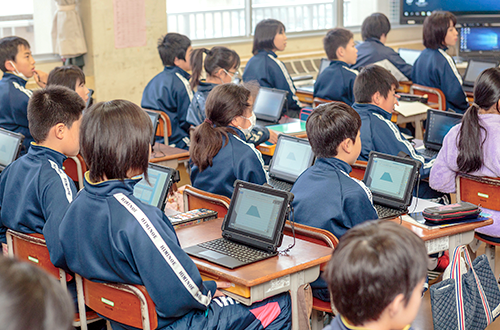 タブレットPCを活用し、考えを伝え合うことを重視した授業を重ねたことで、生徒が課題意識をもち、意欲的に学び合う力が育成された。この取り組みがコミュニケーション能力を高め、さらに学力向上に大きく寄与したとの判断から、2017年度に全小中学校へタブレットPC導入を拡大した。