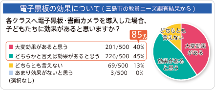 事実、整備後に実施した教員へのアンケート結果では、電子黒板等の子どもたちへの効果として、「大変効果があると思う」と答えた教員が整備前の44%から77%に。また、電子黒板の整備に伴う教員の負担についても、「軽減された」と感じる教員が27%から63%と、いずれも飛躍的に増加している。